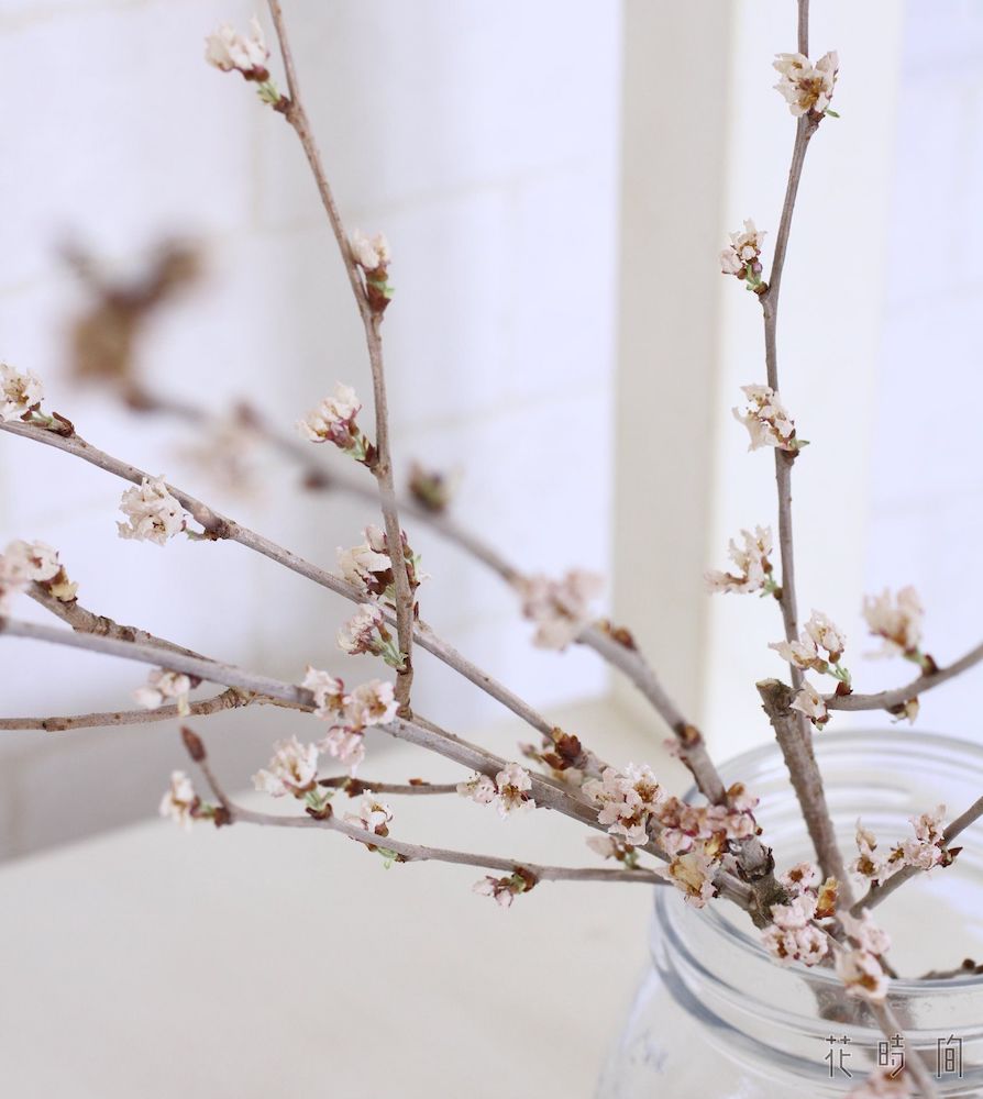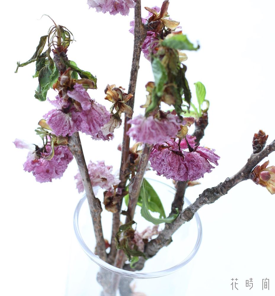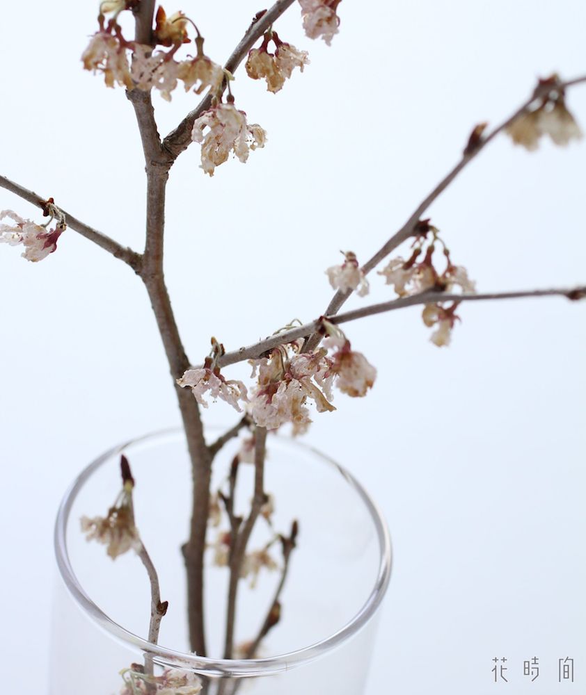 いずれにせよ、肝心なのは、「しっかりと花が開いた枝を選び、新鮮なうちにドライフラワーにすること」です。サクラの季節は、まだ寒の戻りもある頃。もしも開花していない枝を買ってしまったら、テーブルの上などに置いて、開花させてからドライに。床の上よりも卓上のほうが、いくぶん、室温は高いためです。