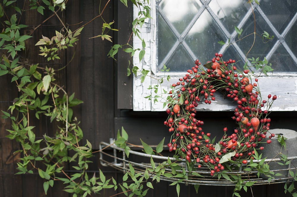 赤、緑、白の定番クリスマスカラーには次のような意味があります。赤はキリストの血、太陽。緑は永遠の命と愛。白は純潔。冬の庭や自然の中にも、この3色を見つけることができます。ローズヒップ(バラの実)やヒペリカム、コトネアスターなどの赤い実や、イチイやコニファーなど、よく生け垣に用いられる常緑樹もリースの土台の定番です。通称「スノーベリー」と呼ばれるシンフォリカルポスやヤドリギの白い実がなるのも、ちょうどこの頃です。