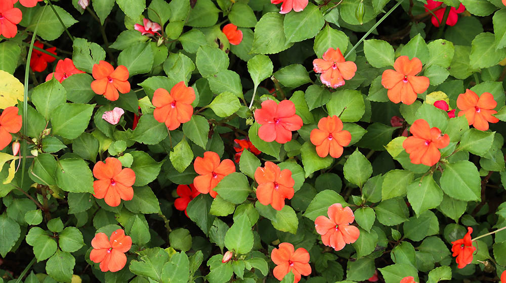 インパチェンスは、ツリフネソウ科ツリフネソウ属(インパチェンス属)の一年草です。草丈は10〜40cm程度とやや低く、こんもりと茂るので夏花壇の前段〜中段に向いています。コンテナやハンギングバスケットなど寄せ植えの素材として使うと、主役にも脇役にもなる中堅どころといった存在です。初夏から秋までと開花期間が長く、多くの草花が苦手とする半日陰の場所でも育てられます。