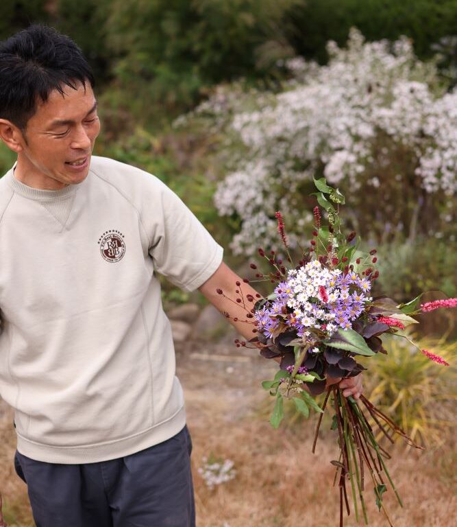八ヶ岳の庭から“摘んで束ねる”秋の宿根草ブーケ 八ヶ岳山麓のエム・アンド・ビー・フローラ社のガーデンで花を集める難波さん。 ガーデンストーリーの人気連載「1鉢で華やか!寄せ植えブーケ」で、いつも素敵な寄せ植えの提案をしてくれる難波良憲さん。じつは、ブーケのような華やかな難波さんの寄せ植えは、実際にアレンジメントブーケからインスピレーションを多く得ています。 「寄せ植え作りを始めたばかりの頃、組み合わせをどうしていいか分からず、自信の持てるものがなかなか作れませんでした。どうやったら素敵にできるのかなと悩んだ時に、参考にしたのがフラワーアーティストさんのブーケなんです」と難波さん。 ブーケから学んだ「主役+脇役+リーフ」の基本構成 ポットマム‘ダンテ’レッドを主役に、リーフをたっぷり使った寄せ植え。植物の個性が引き立ち、シックかつ華やか。 寄せ植えでは、主役級の花を複数合わせると、それぞれの個性が競い合い、全体の見どころが分散しやすくなります。 「それって寄せ植え‘あるある’で、私も主役級を集めては、魅力を埋もれさせてしまうということがよくありました。素敵なブーケは主役と脇役がはっきりしていて、リーフがまとめ役。寄せ植えも同じ。主役+脇役+リーフの構成を意識するようになってから、ようやく自分でも納得のいく仕上がりになってきました」(難波さん) 基本の「ラウンドブーケ」を学び、庭の花でブーケづくり 難波さんは実際に東京のフラワーアーティストの教室へ通い、アレンジメントも習得。今では四季の素材が揃う八ヶ岳の会社の庭から花を摘んで、同僚や家族にブーケを贈ることもあります。 白い小花がレースのように可憐なクジャクアスター。 「庭の花はフラワーショップの花とは少し違って、茎が曲がっていたり、葉が虫にかじられていたりすることもありますが、旬の花を摘んで組み合わせるのはとても楽しいです。アレンジにすることで新たな発見があり、それが寄せ植えに生きることもたくさんあります」と難波さん。 庭のある暮らしを寄せ植えのみならず、アレンジにも展開して楽しんでいます。 材料と色の考え方|秋色×質感のミックス 秋の宿根草が鮮やかな色彩を放つ八ヶ岳山麓のエム・アンド・ビー・フローラ社の庭から、花材を集めながらアレンジの基本「ラウンドブーケ」を作ってもらいました。 <花材> 主役/クジャクアスター 脇役/ワレモコウ、ペルシカリア、ムラサキシキブ まとめ役リーフ/スモークツリーの葉 <手順> 下葉を落として、茎を斜めにカットして吸水面を広げます。 主役のクジャクアスターの小花を束ねて色の面を作ります。(右利きの場合)左手で最初の1本を持ち、右手で新たな花を足していきます。茎が重なる支点は上下にずらさないように持ちます。 ワレモコウとペルシカリアを重ねていきます。ブーケを時計回りに回しながら、やや斜めに傾けて新たな花を一方向に重ねていくと、らせん状に束ねられます。 スモークツリーの葉をブーケの下側に同様に入れていきます。 麻ひもで、束ねていた際の支点を縛って整えます。1回目できつめに縛って、やや形を整えてから同じ位置でもう一度縛ると安定します。 茎の下部を揃えて切り、水揚げさせて完成。 寄せ植えにも効く! ブーケ理論の3ルール 1 主役の面×線でリズム×葉色で締める フォルムの違いを意識してセレクトすると、立体感のある形になり、互いの個性も引き立ちます。 2 同系色グラデで面づくり+効かせ色少量 主役の面の色相は崩さないように。斑入りや銅葉は強い補色がぶつかる場合も「色の緩衝材」として活躍してくれます。 3 花径バランス「大1:中2:小3」で散らしすぎない 大は存在感を示す点数でOK。中で主景を支え、小で余白の演出を。 秋の庭を格上げする宿根草7選(ブーケ外も含む) ※各項目は 開花期/草丈/日照・耐暑性/切り花適性/相性 の順 カリオプテリス ‘ゴールドクレスト’ 5–10月/40–50cm/日向・高温に強い/切り花◎(青花×斑入り葉)/相性:サルビア、コスモス ユーパトリウム ‘チョコレート’ 8–10月/80–100cm/日向~やや半日陰・暑さに強い/切り花◎(白花×銅葉で締まる)/相性:アスター、銅葉ダリア 日本に自生するフジバカマもユーパトリウムの仲間。アサギマダラの食草として有名。 クジャクアスター 9–11月/80–150cm/日向・強健/切り花◎(小花で“面”づくり)/相性:ワレモコウ、ペルシカリア ワレモコウ 7–10月/80–120cm/日向・やや湿りが好き/切り花◎(線の動きが出る)/相性:グラス類、アスター ペルシカリア 葉模様が美しいペルシカリア・ミクロセファラ。photoPOU/Shutterstock.com 6–10月/70–120cm/日向~半日陰・丈夫/切り花◎(赤穂が効く)/相性:ホスタ、ルドベキア 赤い穂花が美しいペルシカリア・アンプレキシカウリス。weha/Shutterstock.com サルビア ‘ローマンレッド’ 6–11月/40–60cm/日向・暑さに強い/切り花○(差し色の赤)/相性:ゴールドリーフ、青花系 サルビア ‘ミスティック・スパイヤ